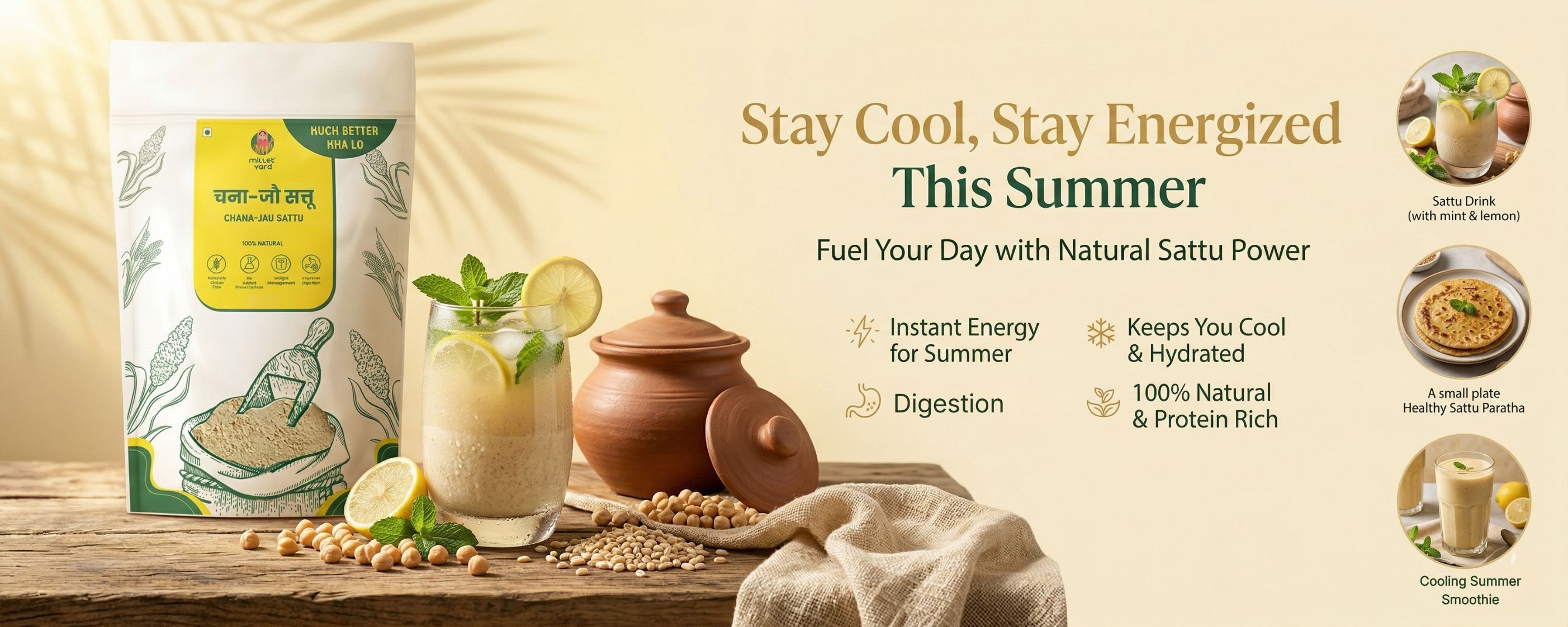 Millet Yard's Chana-Jau Sattu is a traditional Indian superfood powder made by roasting and grinding chickpeas (chana) and barley (jau). It is rich in protein, dietary fiber, iron, and essential minerals, offering sustained energy, digestive support, and overall nutritional benefits.